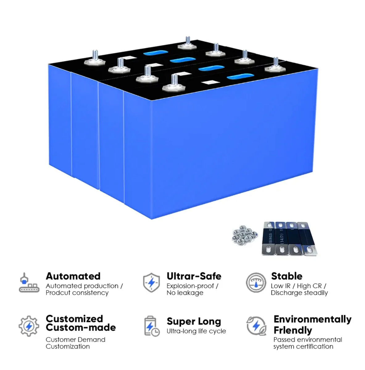 • For 12V system: Connect 4 cells in series (4×3.2V = 12.8V nominal).
