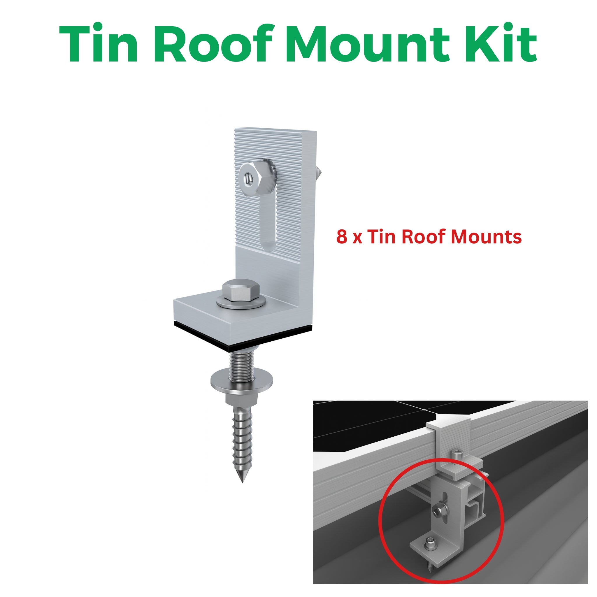 - Tin Roof Mounting Kit: Includes 8 Tin Roof Mounts